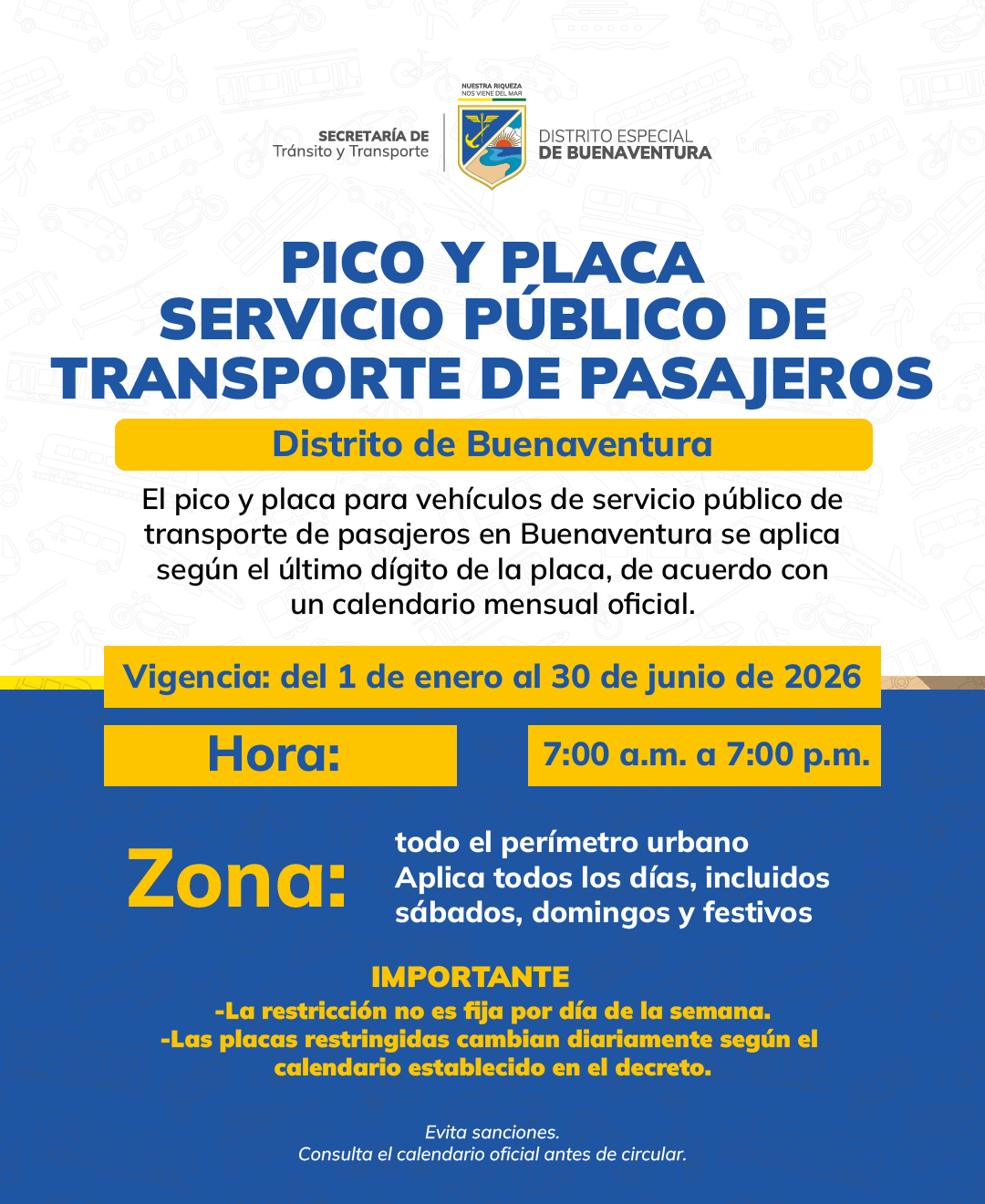 La Alcaldía Distrital de Buenaventura estableció la nueva rotación de la medida de pico y placa para el primer semestre de 2026, la cual comenzará a regir a partir del martes 13 de enero y estará vigente hasta el 30 de junio, según lo dispuesto en los decretos 0408 y 0409 expedidos por la Secretaría de Tránsito y Transporte.