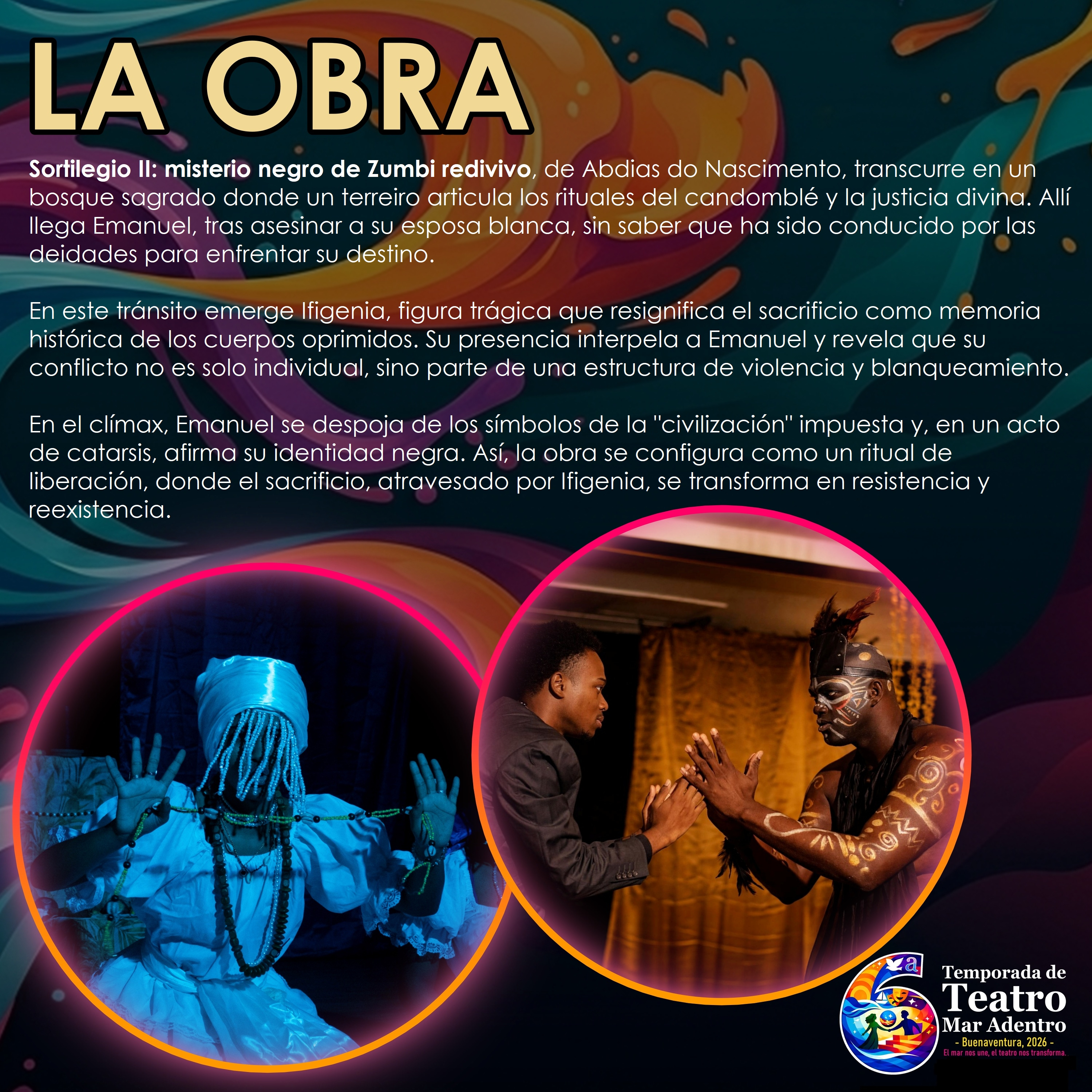 Agradecemos la solidaridad y comprensión de nuestro público. Reafirmando nuestro compromiso con la agenda cultural de la ciudad, anunciamos que este martes 14 de abril subirá a escena una pieza poderosa y necesaria para el contexto del Pacífico: “Sortilegio II: Misterio negro de Zumbi redivivo”.