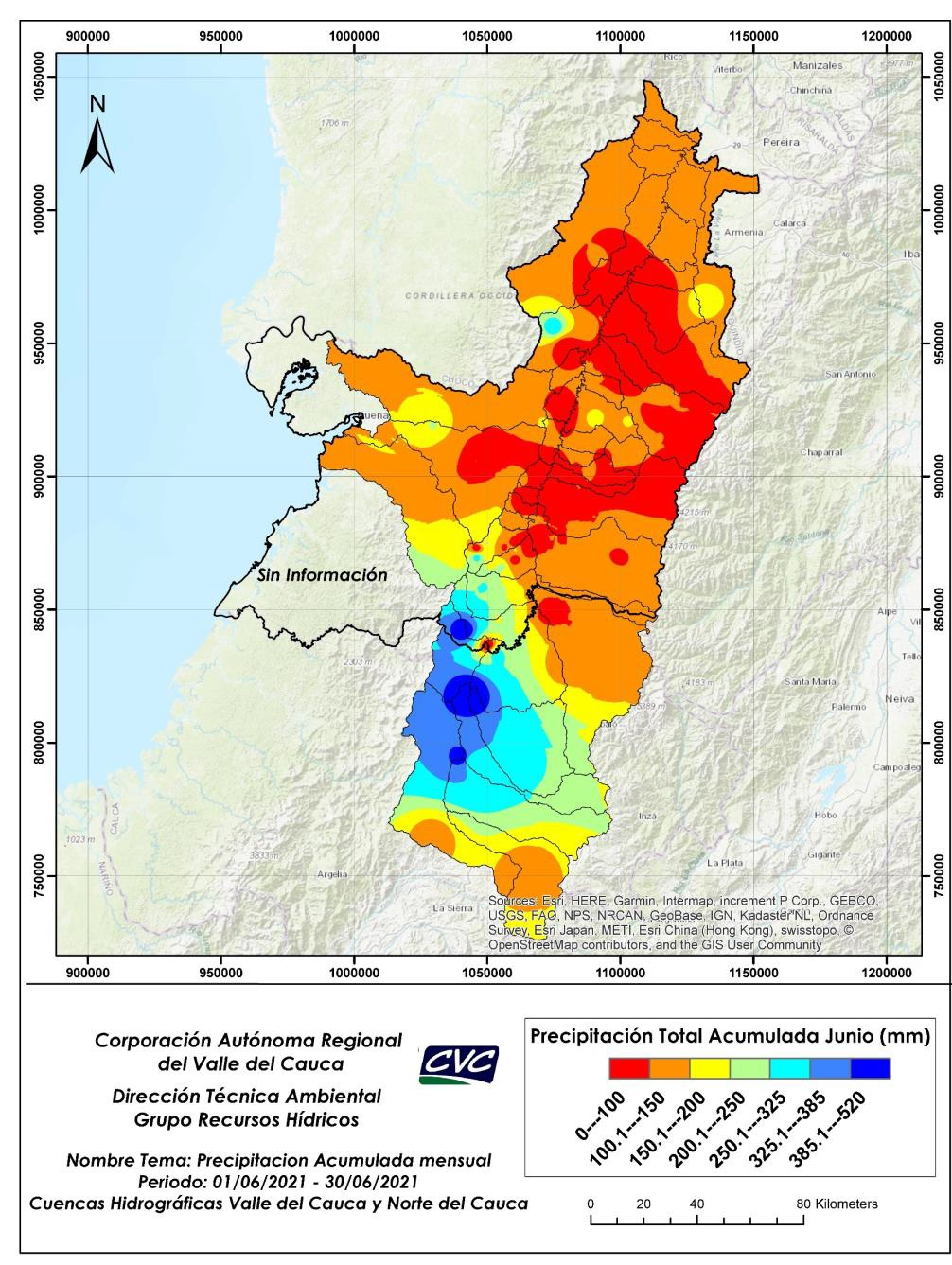 Durante junio, las precipitaciones alcanzaron un superávit del 69 % del total de lluvias en el Valle del Cauca y su zona de influencia. Los mayores excedentes estuvieron concentrados en el departamento del Cauca (área de influencia).
