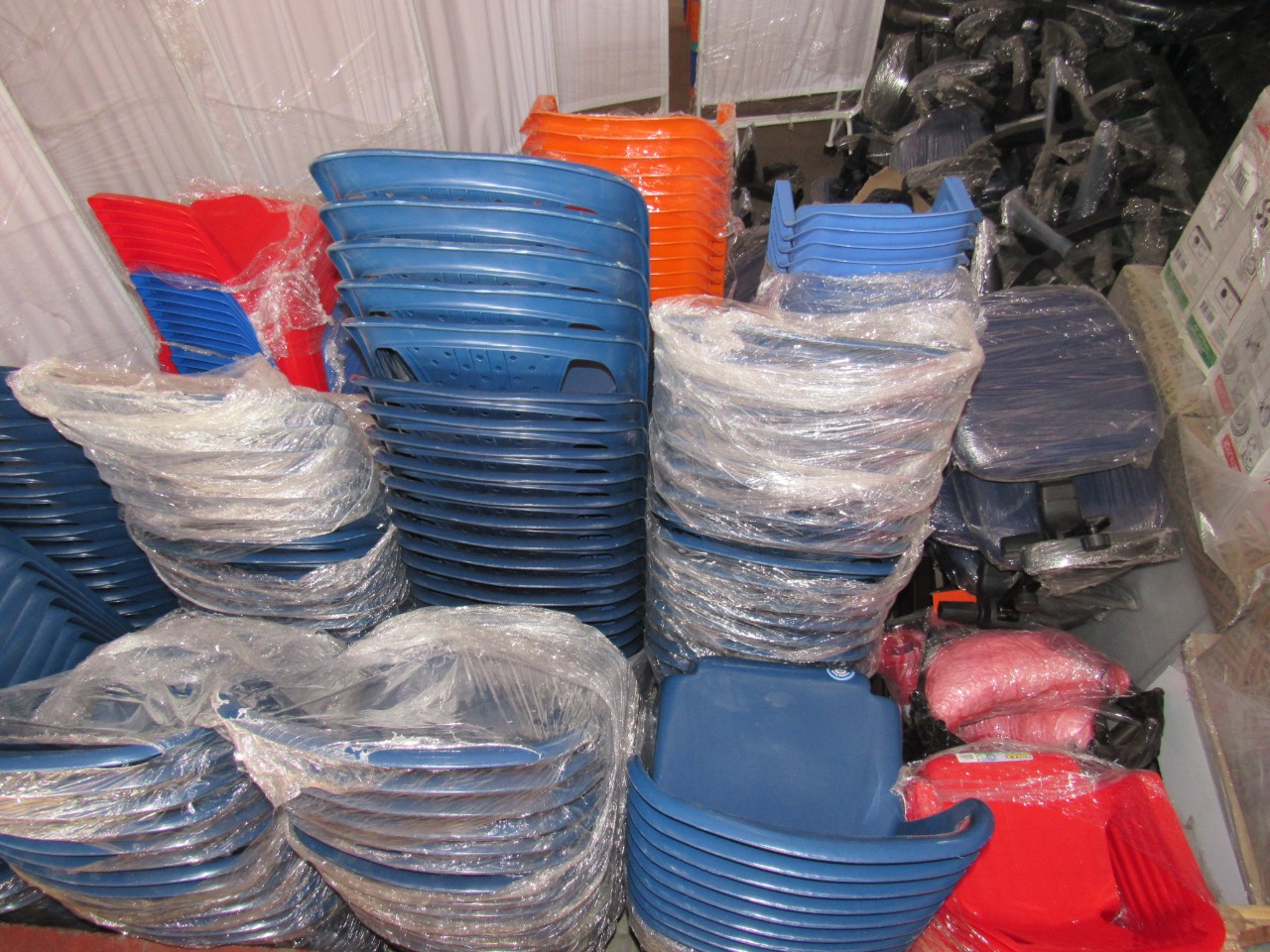 Archivadores, armarios cajoneros, bibliotecas, escritorios de oficina, pupitres, sillas plásticas infantiles, tableros, ventiladores (pared y techo), comedores de cuatro y seis puestos, así como pórticos multifuncionales.