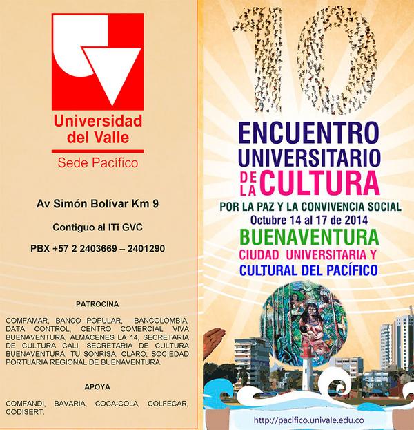 Con el tema central de la paz y la convivencia social, la Universidad del Valle Sede Pacífico realizará el Encuentro Universitario de la Cultura en su versión No. 10, con invitados de México, y presentaciones de K’nutos Fusión, Vino Tinto, Grupo Bahía, Socavón, entre otros artistas y universidades invitadas.