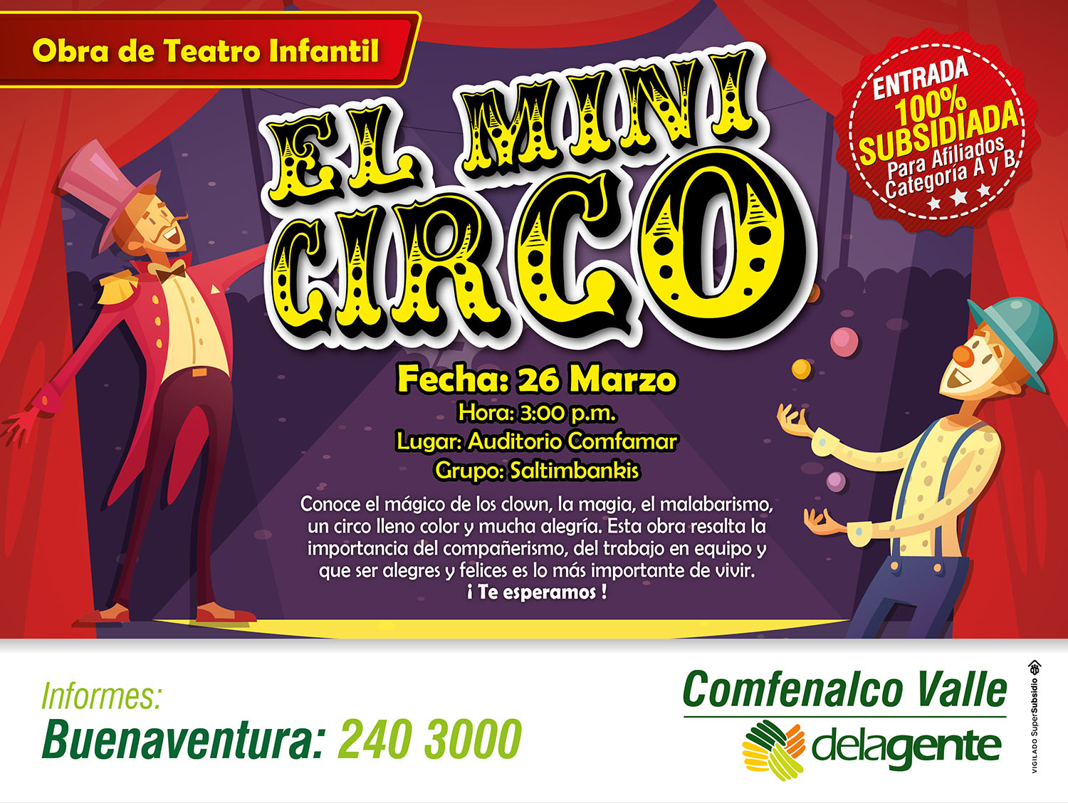 Clown, magia, malabarismos, color y mucha alegría se podrán a prueba en El maravilloso espectáculo “Mini Circo” que por primera vez presenta para sus afiliados en Buenaventura la Caja de Compensación Familiar Comfenalco Valle delagente el próximo domingo 26 de marzo a las 3:00 de la tarde en el auditorio del Centro Cultural de la entidad.