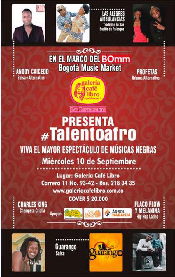 En el marco del Bogotá Market Music (Bomm) Talento afro le pondrá ritmo a la capital del país con un showcase diferencial que contará con la participación de artistas como: Las Alegres Ambulancias, de San Basilio de Palenque, Anddy Caicedo, intérprete de Salsa, Flaco Flow y Melanina (hip hop), Charles King (Champeta criolla), Profetas (urbano-alternativo) y Guarango (salsa). La presentación se realizará en Galería Café Libro del Parque de la 93 partir de las 8:00 p.m.