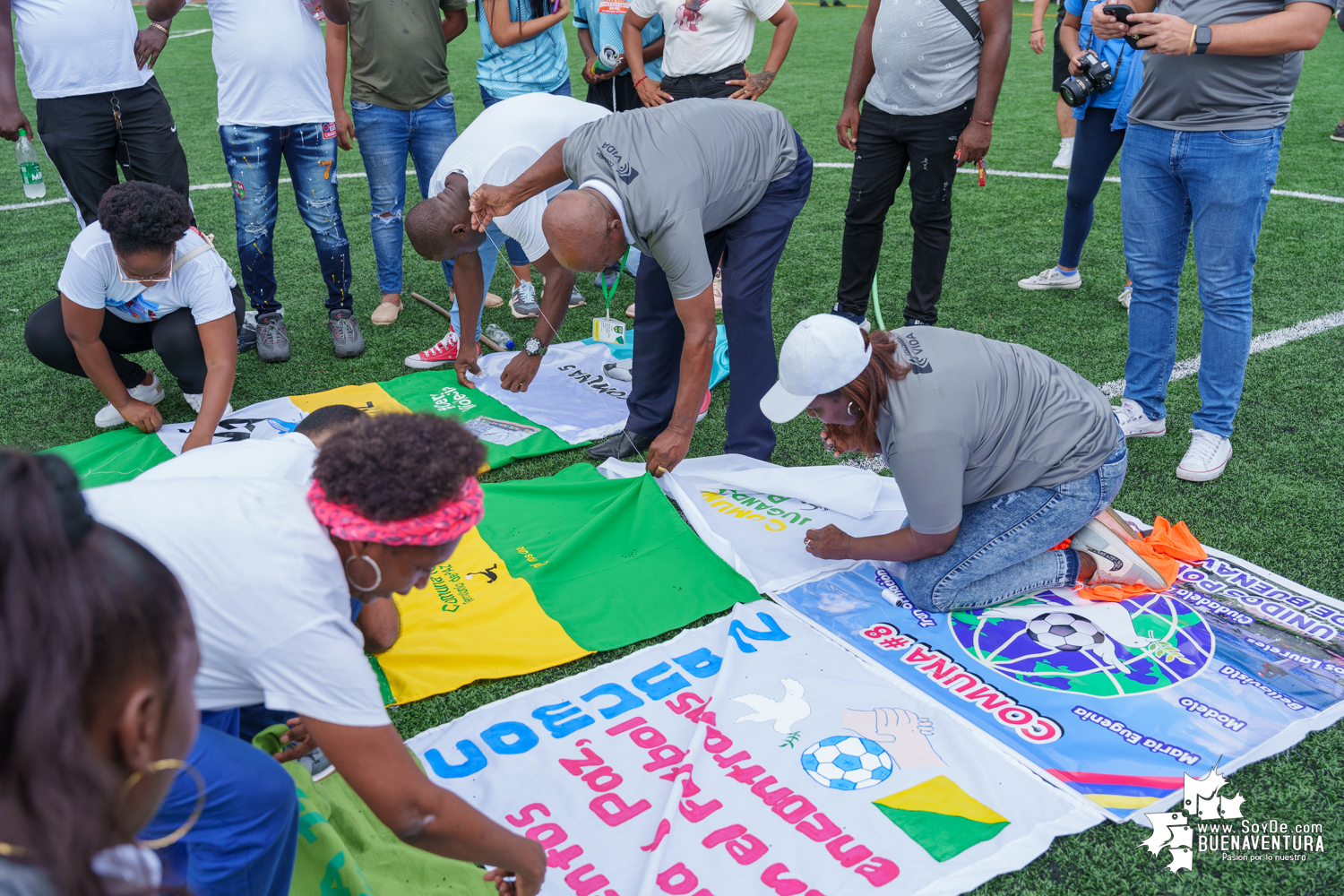 Esta fiesta por la paz y el deporte contará con un desfile de los equipos de fútbol inscritos que iniciará en el barrio La Independencia, con un recorrido en el que cada grupo ondeará su bandera como símbolo de unión, solidaridad y respeto. En un acto protocolario en la cancha del barrio Bolívar, se dará el saque de juego al primer partido femenino que formaliza el inicio del torneo. El distintivo de cada equipo se unirá en un tejido que se denominará la ‘bandera de la paz’.