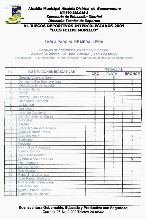 Cuadro de Posiciones suministrado por la Dirección Técnica de Deportes